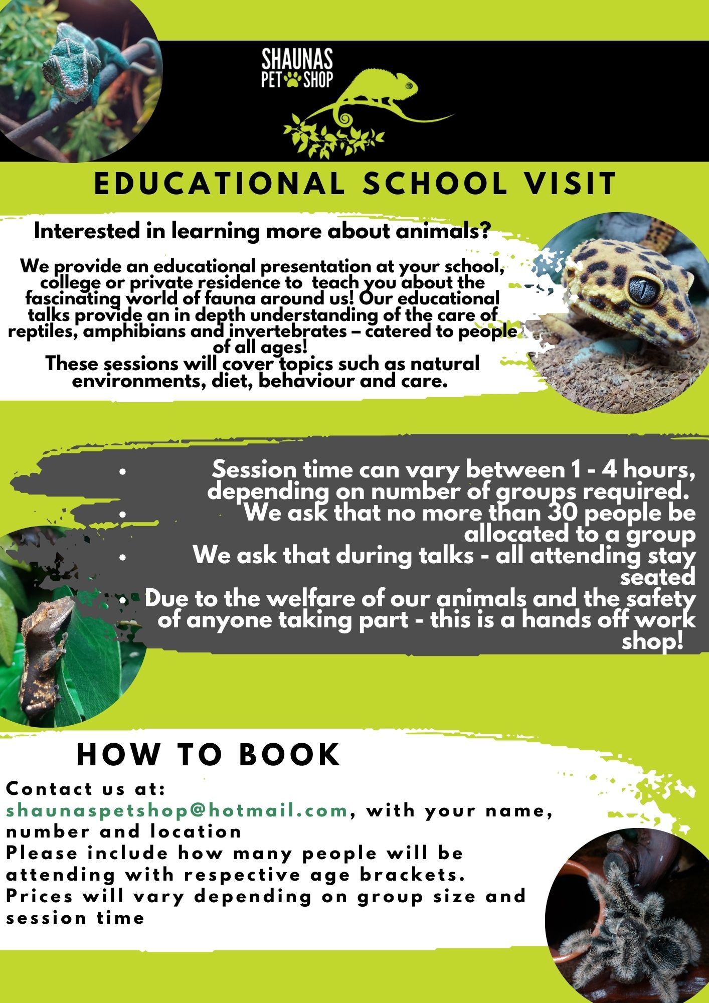 In your message, Please include your location, facility (School, College or Private Residence), and how many people will be attending with respective age brackets.